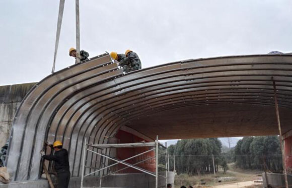 在波纹板安装位置搭设脚手架, 安装前要准确定位管轴线, 拼装的时候注意中间板片和端头板片的位置, 端头管轴单向拼装, 每3米校对一次管节位置和弧度、 轴线和坡度, 如果出现偏差, 需要采用千斤顶进行纠正。波纹管整体加固的, 从中心向两端进行对称安装, 先安装底片, 在分别向上面拼接,安装完成后要求回填好基础或管底边缘。
